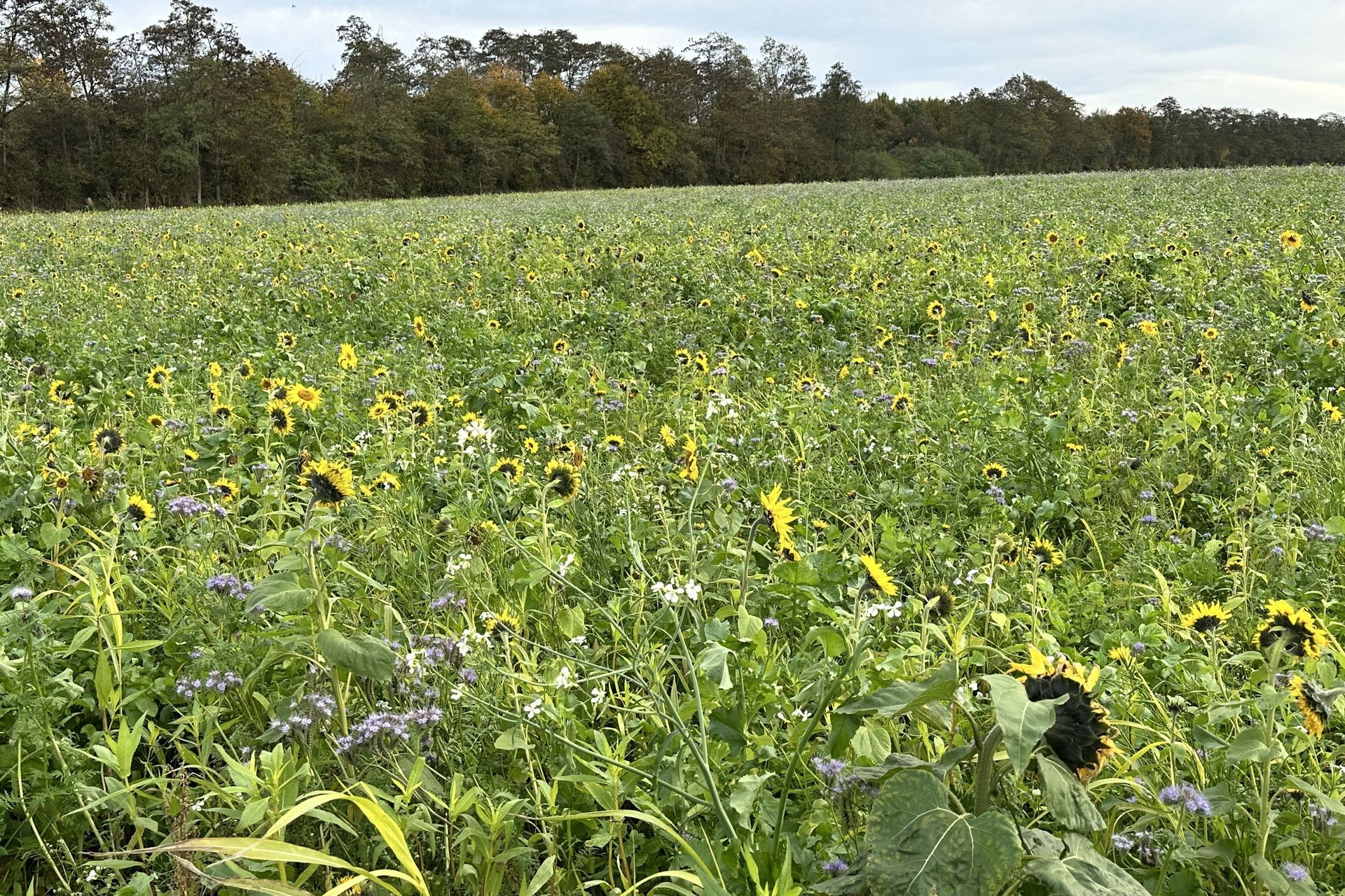 Während traditionell Lupinen, Gelber Senf, Ölrettich oder Buchweizen als Gründünger genutzt werden, setzt die moderne Landwirtschaft auf neue Mischungen, zu denen, wie hier an der Alten Hagemer Landstraße, zwischen dem Hof Boller und dem Damm der ehemaligen Zechenbahn, auch Sonnenblumen zählen. So wird aus dem einheitlichen Gelb oder Weiß ein bunter Mix an Farben, sehr zur Freude der Betrachter.