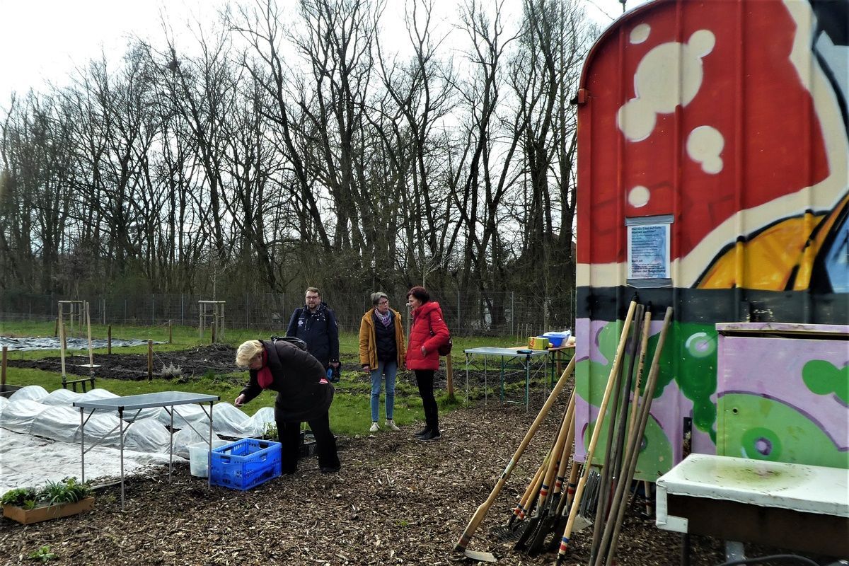 Im „Garten der Begegnung“ im Schatten der Flüchtlingsunter-kunft an der Markfelder Straße treffen sich seit zwei Jahren Geflüchtete und Dattelner und Dattelnerinnen. Auf einem Areal, das ihnen von der Stadt zur Verfügung gestellt wird, erfreuen sie sich an den des Gärtnerns. Sie erfahren gemeinsam, was es bedeutet zu säen und zu ernten. Gesunde Ernährung, Selbstver-sorgung, Werkeln an der frischen Luft, Erfahrungsaustausch mit Gleichgesinnten, aber auch Raum für Geselligkeit oder Rückzugs-ort für Erholung mögen die verschiedenen Antriebsmotoren der Beteiligten sein. Für alle aber gilt das Motto: Nachhaltig gärtnern und etwas fürs Klima tun!