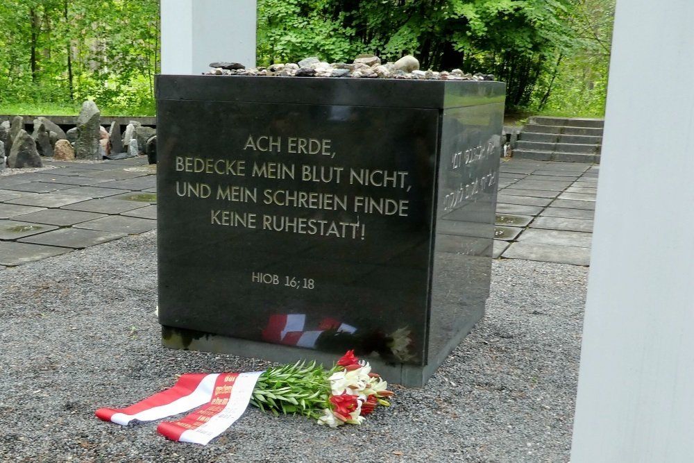 "Hier im Wald von Bikernieki wurden in den Jahren 1941-1944 durch das NS-Regime und dessen freiwillige Helfer tausende Juden aus Lettland, Deutschland., Österreich und Tschechien sowie politisch Verfolgte und sowjetische Kriegsgefangene ermordet."