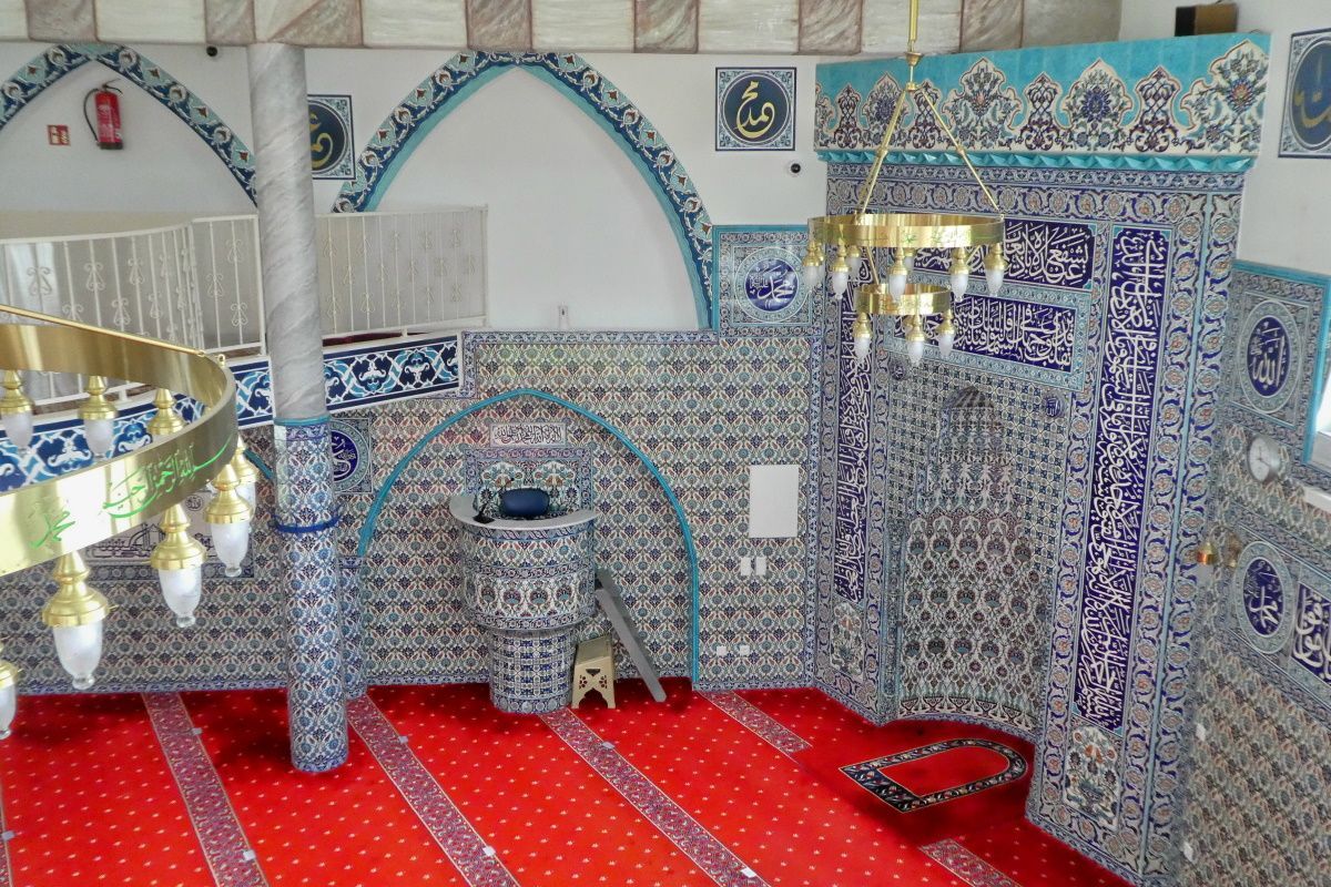 Der zentrale Gebetssaal der Moschee befindet sich im ersten Stockwerk des Gebäudes. Er ist durch die Predigtkanzel, die nach Mekka hin ausgerichtete Gebetsnische, den Lehrstuhl und den Muezzinplatz. An den Wänden prunken blau-weiße Fliesen, die aus einer Manufaktur in der türkichen Stadt Kütahya stammen, die bekannt ist für ihre farbenprächtig verzierten Tonwaren und Fliesen. Auch die Fliesenleger kamen damals aus der Türkei. Von der Decke strahlen neue vielarmige Leuchter, die ebenfalls aus der Türkei beschafft wurden.