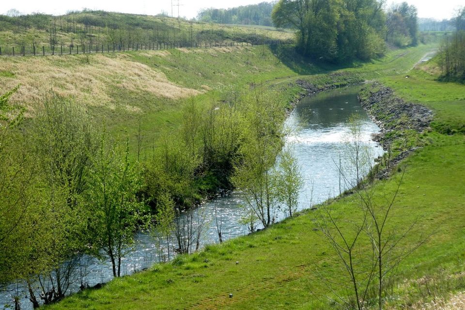 So kommen wir wieder zur Emscher, die hier zwar sauber, aber noch nicht umgebaut ist. Wir nehmen den Emscher-Radweg in östliche Richtung und passieren den Holzturm des japanischen Künstlers Tadashi Kawamata, der 2010 im Rahmen der Emscherkunst auf einer Anhöhe in der Nähe des Wasserkreuzes von Emscher und Rhein-Herne-Kanal in Recklinghausen installiert wurde. Bald erreichen wir das dritte Ziel der Fahrt, den Emscher-Durchlass (28 km). Hier ist der Übergang zwischen der umgebauten, bereits fertiggestellten Emscher und dem ehemaligen Kanalausbau des Flusses noch deutlich erkennbar.