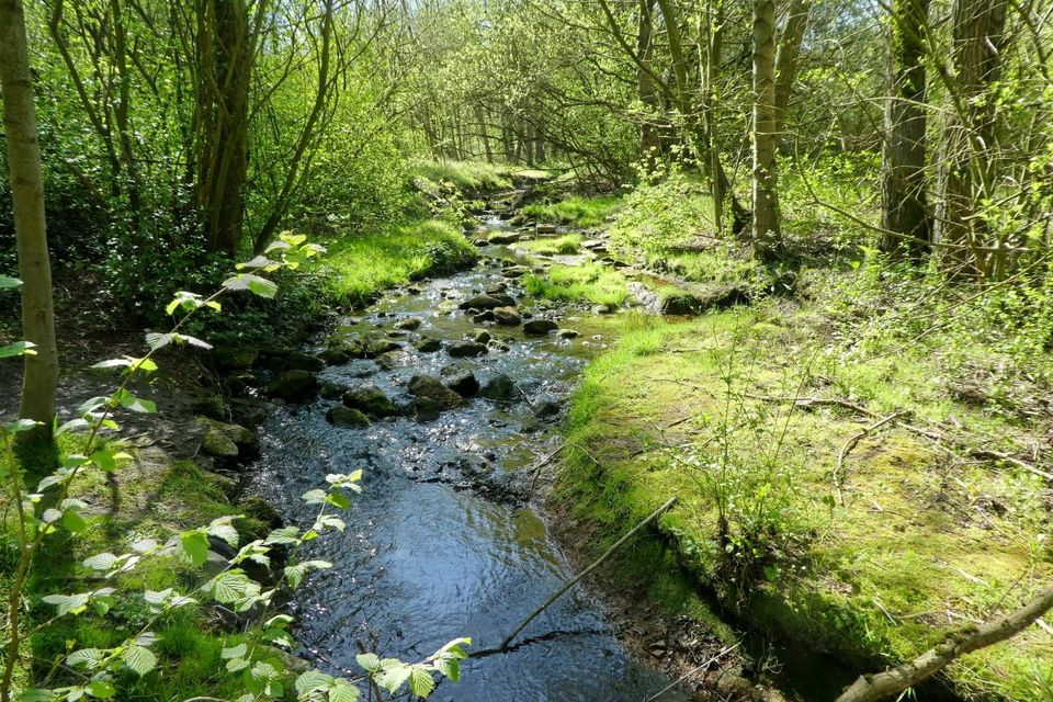 An der ersten Brücke (Nierholzstraße) kreuzen wir rechts den Bach und fahren am Rand der Siedlung Deininghausen in das Waldgebiet Grutholz hinein. Wir nehmen die erste Abbiegung nach links, verbleiben in der Nähe der Bebauung; bald passieren wir den Waldspielplatz und das Wildgehege