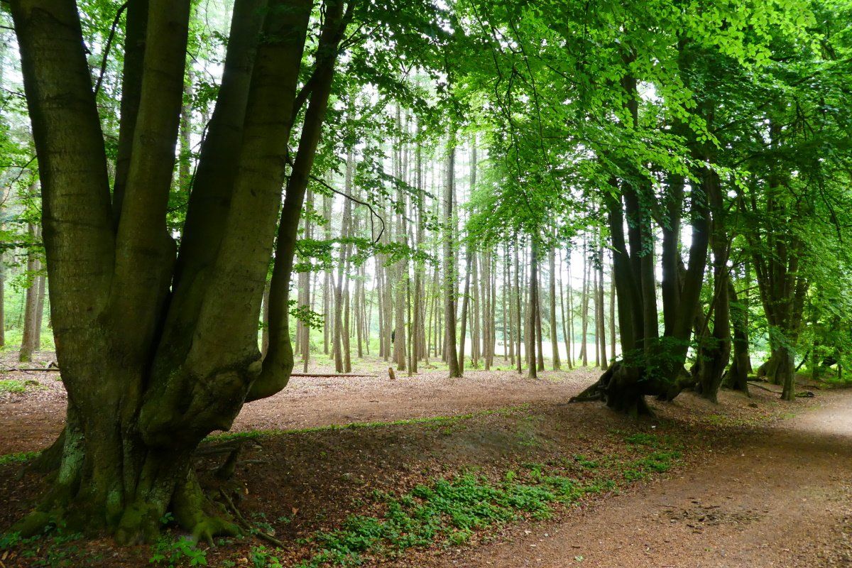 Bizarre Formen einer markanten Baumreihe, die als Buchenhecke angepflanzt wurde und dann hochwachsen durfte. Unweit vom Parkplatz Katenkreuz führt der ausgeschilderte Rundweg vorbei an einem kleinen Wall, auf dem eine Reihe bizarre Bäume stehen. Es sind Buchen, die früher einmal eine lichte Hecke bildeten, um die Felder von Wildtieren freizuhalten. Die Bäume wurden eng gepflanzt, drei auf einen Meter. Wenn sie etwa 1 bis 1,5 Meter hoch waren, bog man sie zu einem Flechtzaun. Drahtsifte hielten sie in der gewünschten Richtung. Im Laufe der Zeit verbanden sich die Stämmchen zu einem dichten Zaun. Als der Zaun dann nicht mehr beschnitten wurde, wuchs er durch zu den heute so bizarr wirkenden Bäumen.