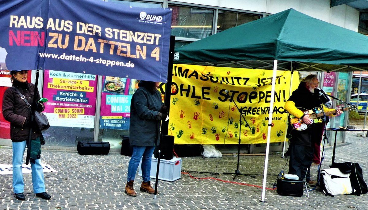 Umrahmt wurde die Veranstaltung von Liedern des Sängers Gerd Schinkel, der am Ende der Kundgebung an der Seilscheibe alle Teilnehmer aufrief, an vielen Orten gegen die fossilen Konzerne ihre Stimme zu erheben, so auch in Lützerath und demnächst wieder in Datteln, wenn es heißt, das Urteil des OVG Münster, das Datteln 4 als „illegal errichteten Schwarzbau“ deklariert hat, wirksam werden zu lassen, wenn es wiederum heißt; „Datteln 4 stoppen wir“.