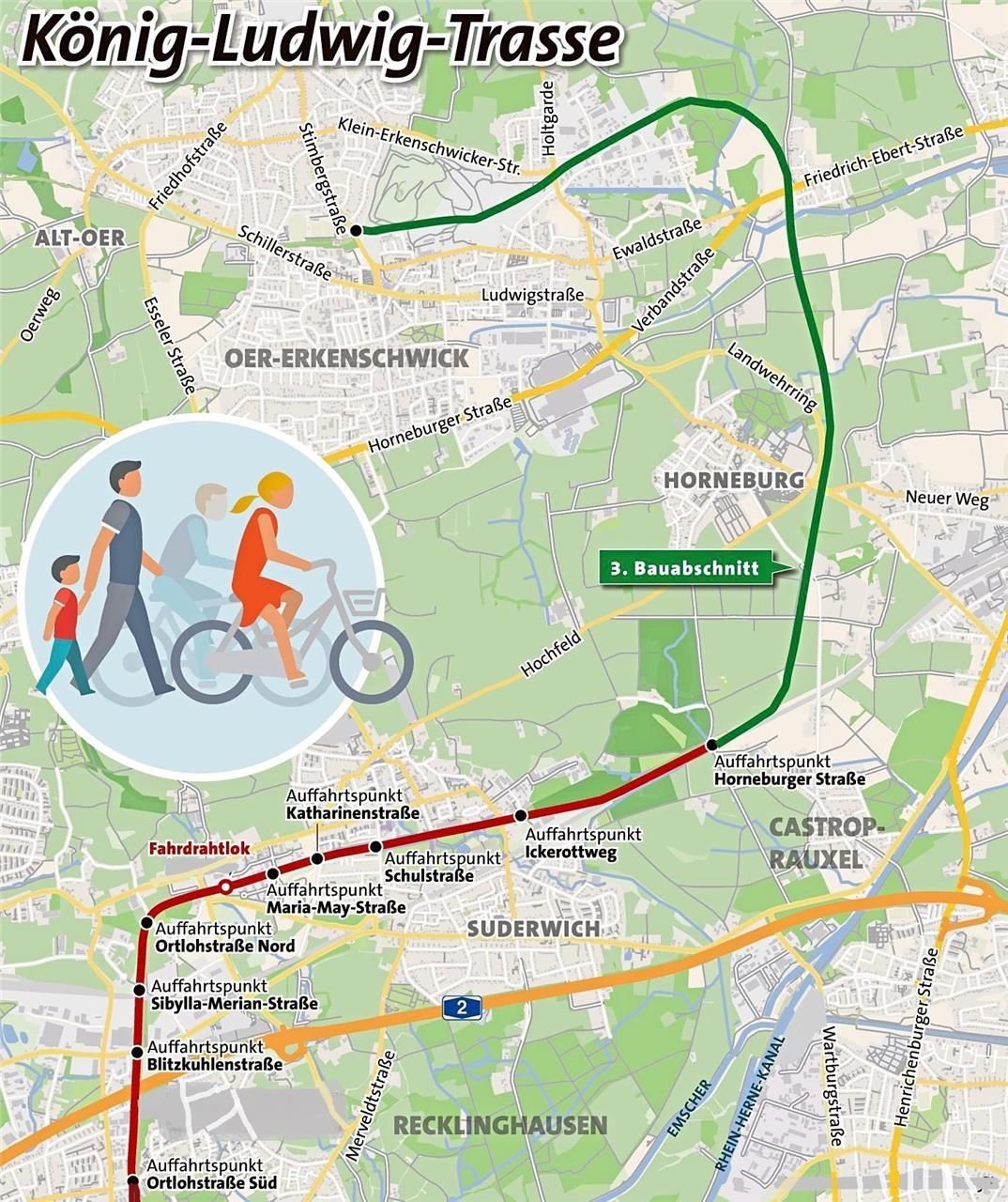 Die König-Ludwig-Trasse endet aktuell kurz vor Horneburg. Von dort soll sie später einmal Richtung Norden verlaufen, dann Richtung Mühlenbach, über die Friedrich-Ebert-Straße, übers Winkelfeld bis zum ehemaligen Zechengelände im Zentrum von Oer-Erkenschwick.
