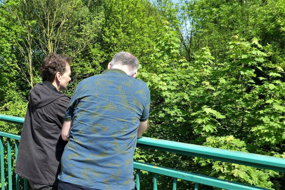 Auf der Brücke an der Dortmunder Straße, unter der die König-Ludwig-Trasse in Tallage geführt wird: Bert Wagener (Grüne Castrop-Rauxel) und Marco Zerwas (Grüne Datteln)