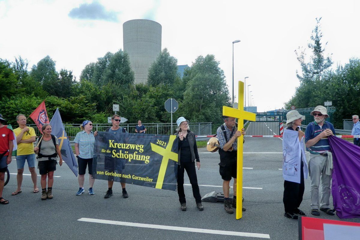 Auf ihrem „Kreuzweg für die Schöpfung“ von Gorleben nach Garzweiler ist am Sonntagnachmittag die Gruppe von Klima-Aktivist*innen in Datteln eingetroffen. Der harte Kern der Pilgergruppe, der über 470 Kilometer in 26 Etappen das gelbe Kreuz von Gorleben nach Lützerath trägt, wurde auf dem Weg von Lünen nach hier von zahlreichen Unterstützer*innen begleitet. Und am Tor 1 des Dattelner Kraftwerks hatten sich bereits etwa 100 Menschen versammelt, die die singenden Wander*innen bejubelten und mit Beifall empfingen. Die sich anschließende Kundgebung verlief friedlich und ohne Zwischenfälle. Musikalische Beiträge aus der Klima- und Friedensbewegung und ein kleines Schauspiel umrahmten die Reden des Nachmittags und unterhielten die Anwesenden prächtig.