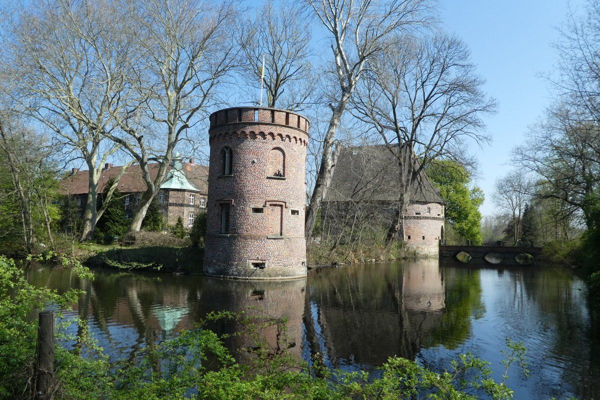 Wir fahren etwa 1 km auf dem Emscher-Radweg, an der ersten Brücke queren wir den Fluss, nehmen den Radweg an der Poppinghäuser Straße nach rechts bis zum Westring, auf dem wir zügig zum Schloss Bladenhorst (13 km)