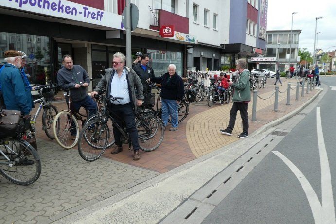 Die Tour begann – zunächst natürlich noch zu Fuß – auf der Hohen Straße und führte dann über Neue Straße und Pahlenort an der Post vorbei zur Kreuzung der Hafenstraße mit dem Südring. Hier gab es für Radler aus Richtung Waltrop kommend einen äußerst merkwürdigen Radwegstummel zu besichtigen.