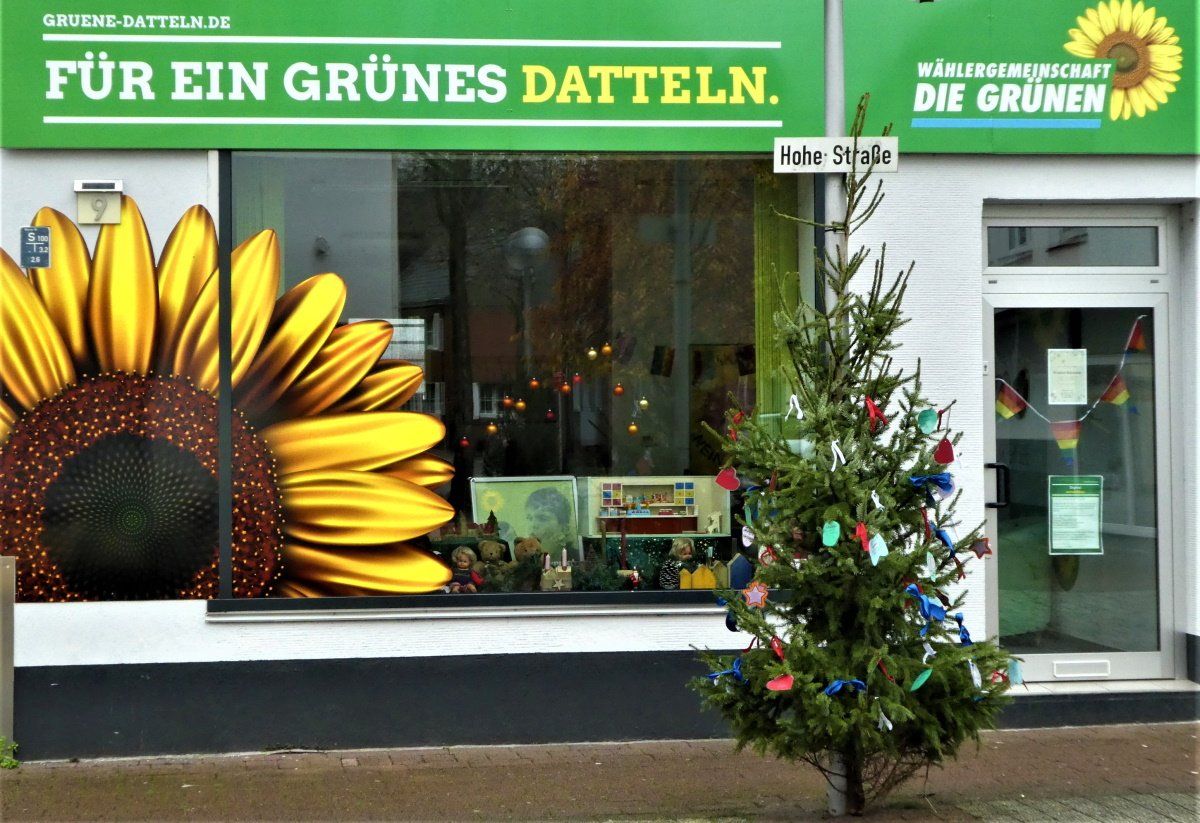 Tannenbäume zieren die Dattelner Innenstadt. Vor dem Büro der Wählergemeinschaft Die Grünen auf der Hohe Straße steht ein Weihnachtsbaum mit Konzept: Er ist mit Anhängern geschmückt und soll fünf Dattelner Vereinen und Initiativen helfen.