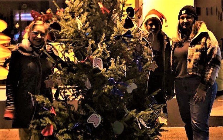 Lisa, Kathy und Laura haben die Wunschanhänger an den festlich geschmückten Tannenbaum gehängt.
