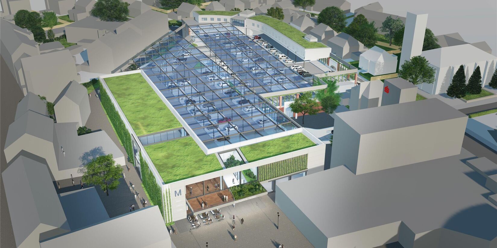 - als ebenerdiger Parkplatz mit fußläufiger Anbindung an die benachbarte Fußgängerzone