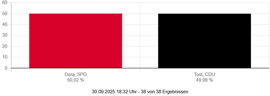 Wir gratulieren André Dora zu seinem Wahlsieg und sprechen André Tost unseren Respekt für seinen fairen Umgang mit der Situation aus. Dass er eine erneute Kandidatur ins Auge fasst, begrüßen wir ausdrücklich. Denn lebendige Demokratie lebt von Vielfalt. Eine so knappe Entscheidung zeigt, wie wertvoll es ist, dass die Bürgerinnen und Bürger zwischen starken demokratischen Alternativen wählen können.