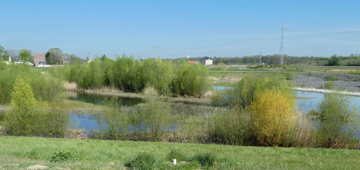 Südlich der Autobahn haben wir das erste Ziel der Tour erreicht: Das Hochwasser-Rückhaltebecken der Emschergenossenschaft an der Stadtgrenze von Castrop-Rauxel-Ickern und Dortmund-Mengede (10 km); hier eröffnet sich uns ein weitläufiges Wegesystem, nach links geht es Richtung Dortmund-Mengede, wir aber fahren nach rechts, umrunden das dortige Becken; überall auf dem Weg ergeben sich neue faszinierende Eindrücke.