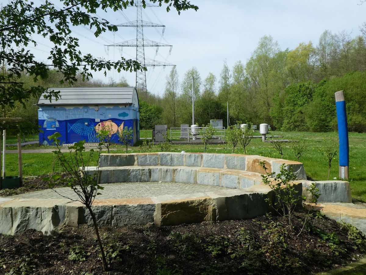 Rechts hinter der Brücke über den Bach hat die Emscher-genossenschaft ein weiteres Blaues Klassenzimmer errichtet.